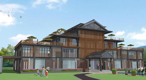 度假酒店周邊環(huán)境整體設(shè)計(jì)風(fēng)格定位為簡(jiǎn)約大氣。度假酒店前保留一定的草坪面積,使酒店一層窗口有比較開(kāi)闊的視野和較好的采光。