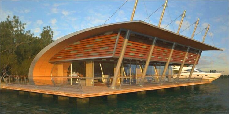 水上建筑設(shè)計(jì)適宜采用通透的建筑外殼,輕盈的建筑造型,因此該水上運(yùn)動(dòng)中心建筑設(shè)計(jì)采用現(xiàn)代風(fēng)格,采用鋼架結(jié)構(gòu)的形式,建筑材料專用采用鋼構(gòu)架、防腐木和玻璃,屋頂設(shè)計(jì)采用流線型,挑出屋頂?shù)闹雍弯摻z拉線與現(xiàn)狀水上高爾夫的張拉膜結(jié)構(gòu)形成統(tǒng)一風(fēng)格。